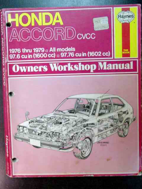 Soft covered book titled HONDA ACCORD CVCC, ALL MODELS OWNERS WORKSHOP MANUAL 1976 through 1979. Printed 1980. 256 pages. Haynes Owners Workshop Manuals are written with the home mechanic in mind who does not have the luxury of a well equipped workshop or factory service tools. This book is in Good condition. Pages are clean and intact, and the binding is tight. Cover shows wear and soiling.
