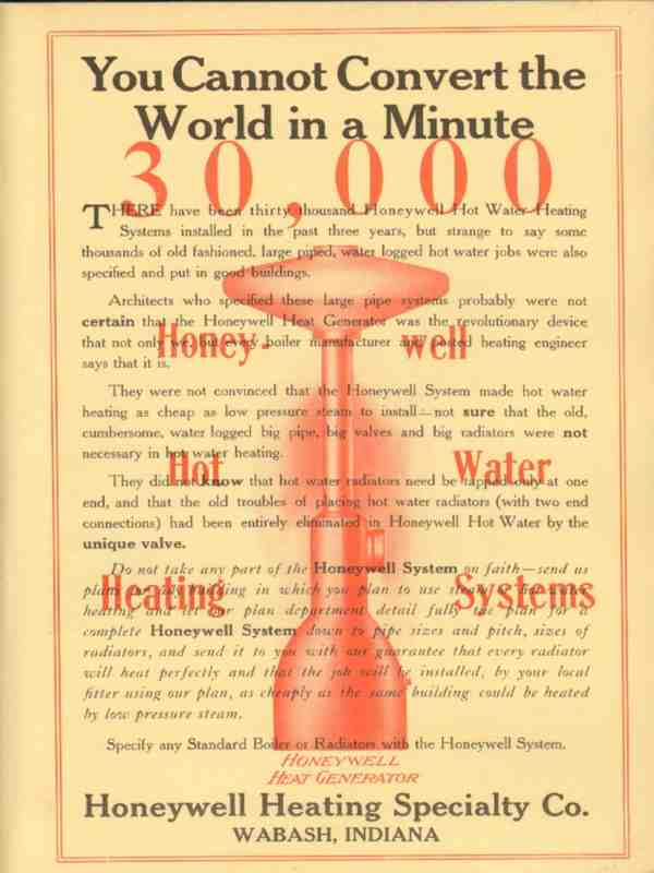 Original vintage architectural trade magazine ad for HONEYWELL HEATING SPECIALTY COMPANY of Wabash, IN. You Cannot Convert the World in a Minute. There have been thirty thousand Honeywell Hot Water Heating Systems installed in the past three years. Old 1910 construction industry advertisement.