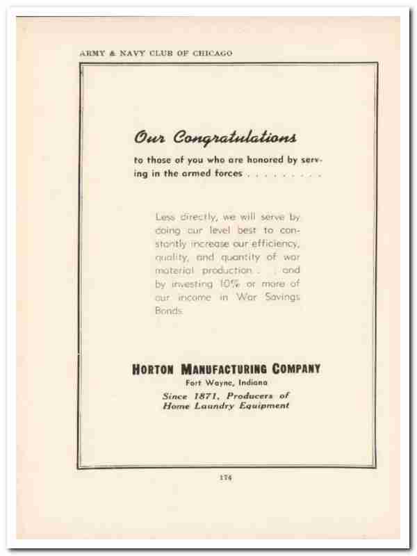 Original WW2 wartime vintage ad for HORTON MANUFACTURING COMPANY. Home Laundry Equipment manufacturers. Our congratulations to those of you who are honored by serving in the armed forces. we will sere by doing our best to constantly increase our efficiency, quality and quantity of war material production, and by investing 10 percent or more of our income in War Savings Bonds.