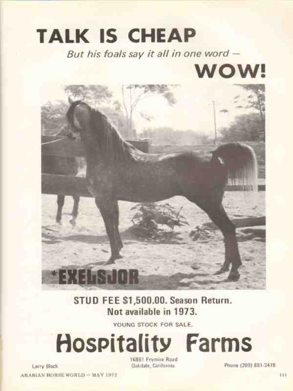 Original old equestrian trade magazine vintage ad for HOSPITALITY FARMS in Oakdale, CA. Exelsjor Arabian horse. Talk is Cheap but his foals say it all in one word, Wow! Standing for stud. Young stock for sale. Larry Black, owner.This unique 1972 Arabian breeding advertisement would display beautifully matted and framed.