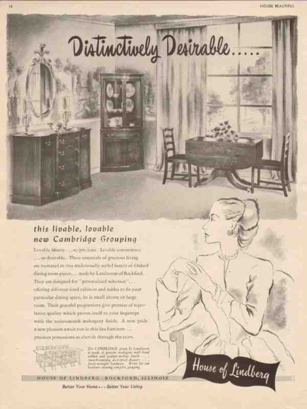 Original home furnishing decorating trade magazine vintage ad for HOUSE OF LINDBERG of Rockford, IL. Distinctively Desirable, This Livable, Lovable New Cambridge Grouping of Dining Room Furniture. Traditionally styled family of Oxford dining room pieces, tables, chairs, cabinets. Old 1947 furniture magazine advertisement. This ad would display beautifully matted and framed.