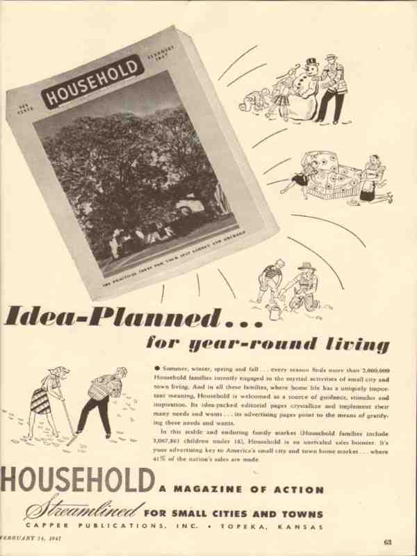 Original vintage media trade magazine ad for HOUSEHOLD Magazine, Streamlined for Small Cities and Towns. Capper Publications, Inc., of Topeka, Kansas. Idea Planned for Year Round Living. Old 1947 magazine advertising industry advertisement, would display beautifully matted and framed.