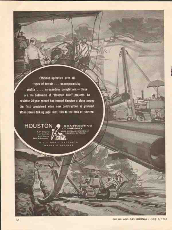 Original oil and gas trade magazine vintage ad for HOUSTON CONTRACTING COMPANY. Main office was located at Buffalo Speedway, Houston, TX. Efficient operation over all types of terrain, uncompromising quality, on schedule completions. These are the hallmarks of Houston built projects. This unique 1962 old oilfield petroleum pipeline industry magazine advertisement would display beautifully matted and framed. Great graphics.