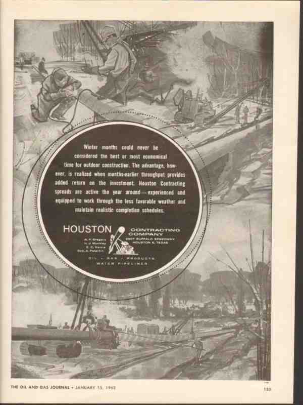 Original oil and gas trade magazine vintage ad for HOUSTON CONTRACTING COMPANY. Main office was located at Buffalo Speedway, Houston, TX. Winter months could never be considered the best or most economical times for outdoor construction. Houston Contracting spreads are active the year around. This unique 1962 old oilfield petroleum pipeline industry magazine advertisement would display beautifully matted and framed. Great graphics.