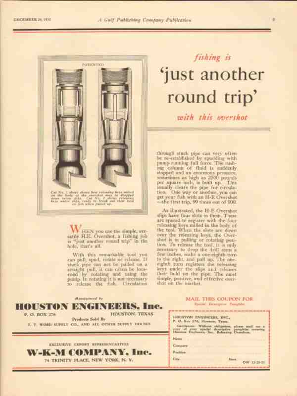Original oil and gas trade magazine vintage ad for HOUSTON ENGINEERS, INC. of Houston, TX. Fishing is Just Another Round Trip with this Overshot. Exclusive export representatives W-K-M Company, Inc. of New York City, NY. Unique 1930 old oilfield petroleum drilling industry equipment magazine advertisement. Nice graphics.