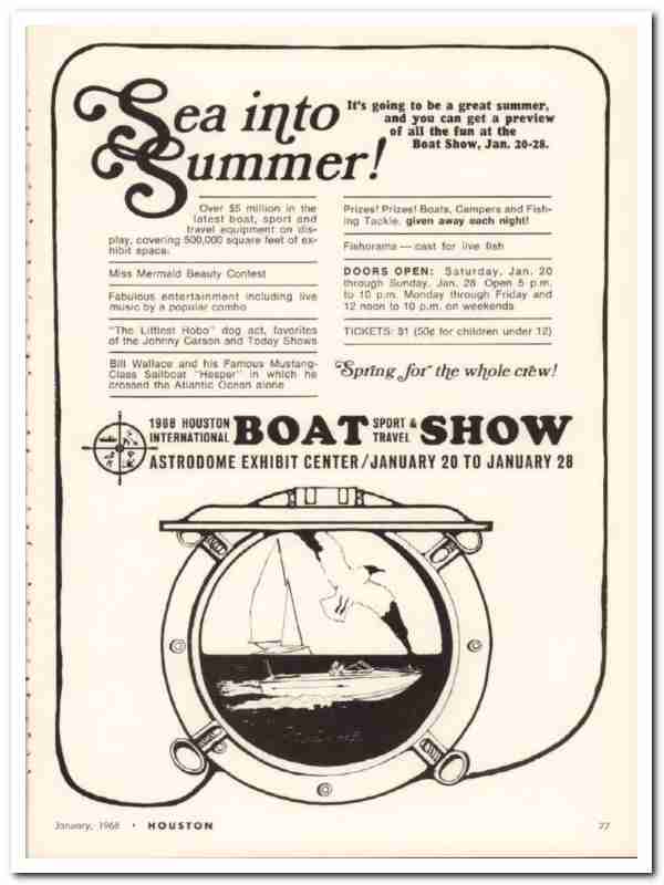 Original 1968 Houston business trade magazine vintage ad for the HOUSTON INTERNATIONAL BOAT SHOW. Was located at the Astrodome Exhibit Center. Sea into Summer! Over $5 million in the latest boat, sport and travel equipment on display, covering 500,000 square feet of exhibit space. This old dated one page boating magazine advertisement would display beautifully matted and framed.