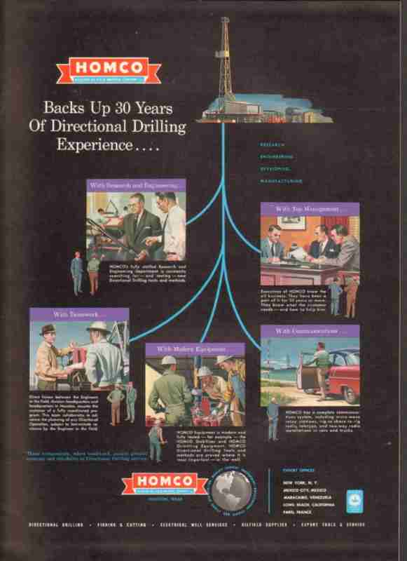 Original vintage oil and gas magazine ad, HOUSTON OIL FIELD MATERIAL COMPANY, INC. Drilling, Cutting, Oil field Supplies, Tools, Houston, Texas. Research, Engineering, Developing, Manufacturing. Old 1959 old HOMCO petroleum industry advertisement would look sensational matted and framed. Approximate size 9 x 12 inches.