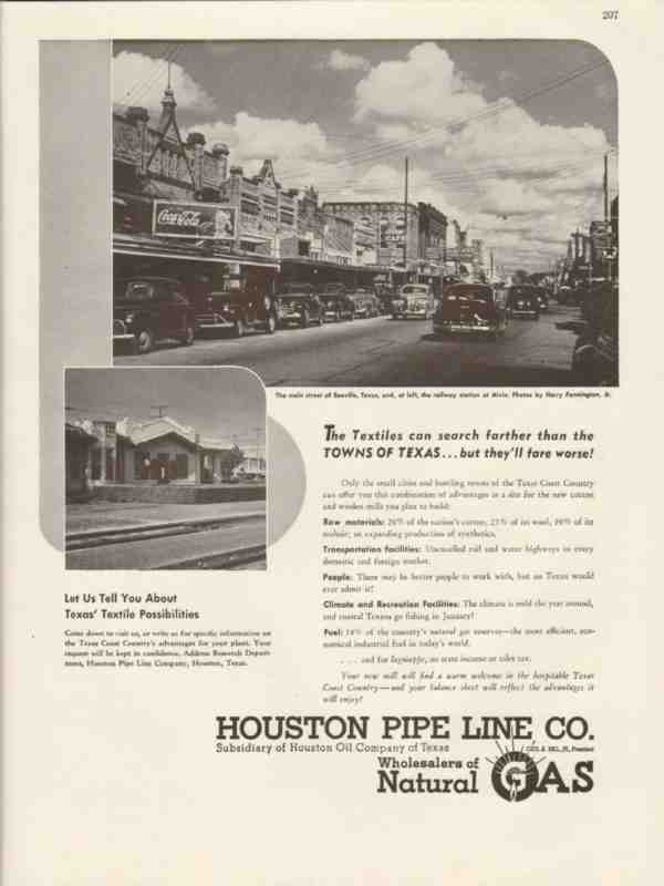 Original old textile trade magazine vintage ad for HOUSTON PIPE LINE COMPANY. Subsidiary of Houston Oil Company of Texas. The Main Street of Beeville, Texas and at left the Railway Station at Alvin. Photos by Harry Pennington, JR. The Textiles can search farther than the Towns of Texas but they'll fare worse! Wholesalers of Natural Gas. This 1947 magazine advertisement would display beautifully matted and framed.