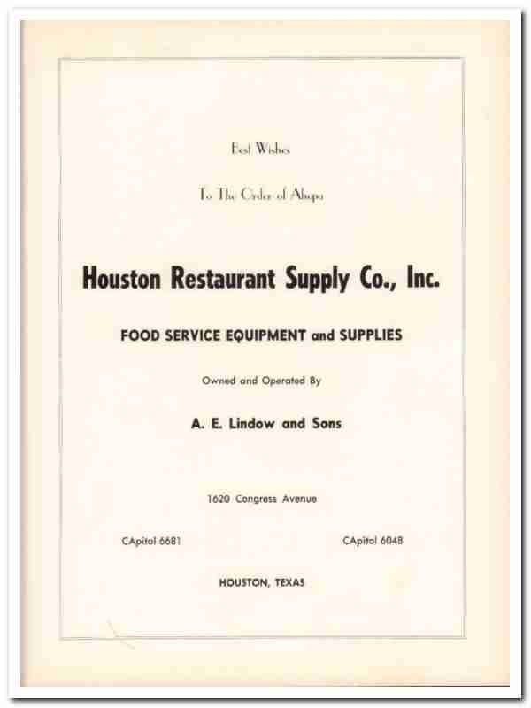 Original 1953 Greek-American business trade magazine vintage ad for the HOUSTON RESTAURANT SUPPLY COMPANY, INC. Was located at 1620 Congress Avenue, in Houston, Texas. Best Wishes To The Order of Ahepa. Food service equipment and supplies. Was owned and operated by A. E. Lindow and Sons.