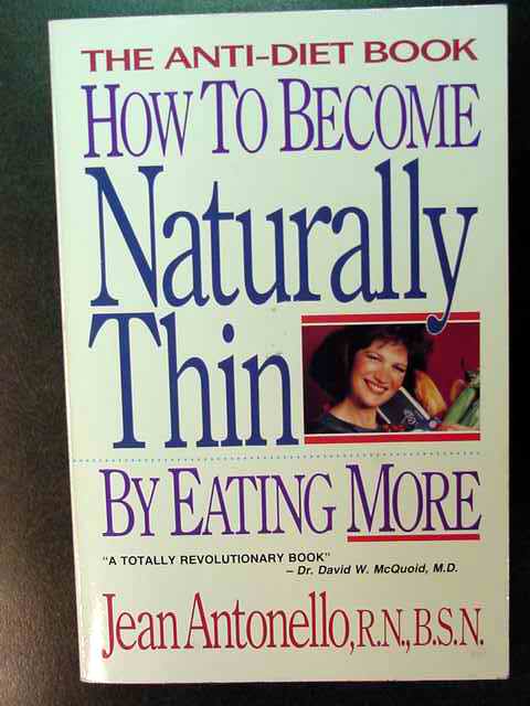Soft covered book titled HOW TO BECOME NATURALLY THIN BY EATING MORE. The Anti-Diet Book by Jean Antonello, R.N., B.S.N., 1989. This book exposes the reason that people are overweight. It's not poor will power, it's not an addiction problem, and it's not emotions. NATURALLY THIN shows the overwhelming physical cause of overweight and tells the reader exactly how to turn her naturally fat body into a naturally thin one - forever! This book is in VG condition. Pages are clean and intact, and the binding is tight. The back cover is slightly creased on one corner. This book would make a sensational addition to any health/diet library!