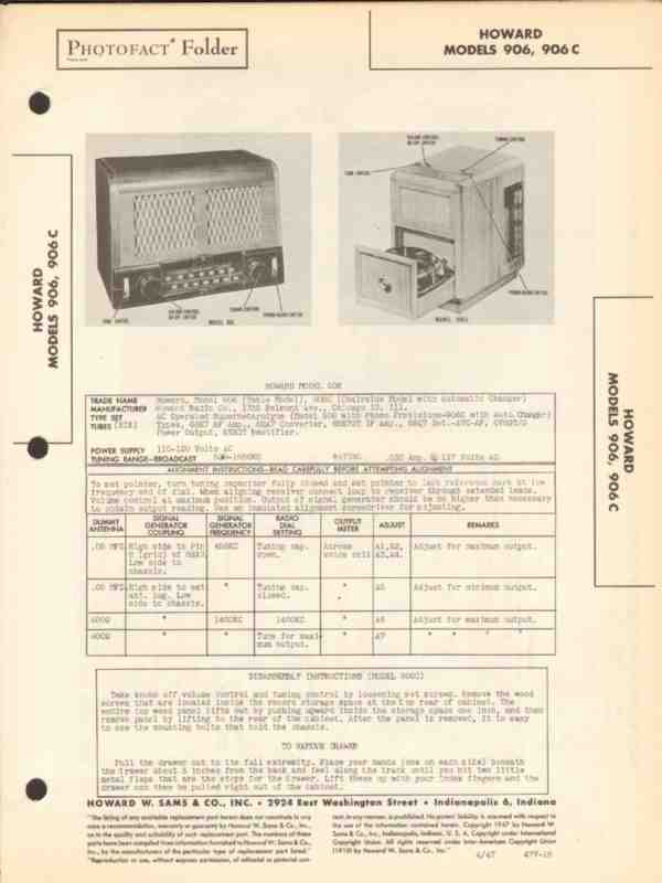 Vintage HOWARD models 906 and 906C combination 6 tube Superheterodyne AM radio receiver. with phonograph record player. Original old Sams Photofact manual includes schematic, layout, alignment instructions, voltage & resistance test charts, repair parts list and description. 4 pages. Dated 1947. Howard Radio Corp., of Chicago, IL. This manual would make a sensational accompaniment to your classic retro radio / phono equipment.