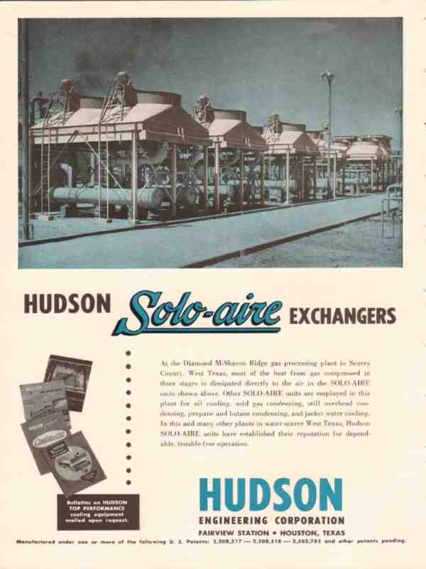 Original oil and gas trade magazine vintage ad for HUDSON ENGINEERING CORPORATION. Main office was located at Fairview Station, Houston, TX. Hudson Solo-Aire Exchangers used at the Diamond M-Sharon Ridge gas processing Plant in Scurry County, West Texas. This unique 1953 petroleum refining process industry magazine advertisement would display beautifully matted and framed.