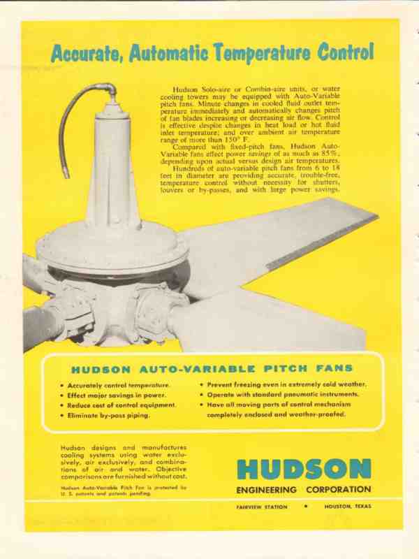 Original oil and gas trade magazine vintage ad for HUDSON ENGINEERING CORPORATION. Main office was located at Fairview Station, Houston, TX. Solo-Aire Cooling with Air used for dissipation of heat directly into the air. Water cooling towers may be equipped with Auto-Variable pitch fans for accurate automatic temperature control. This unique 1955 old two-sided petroleum refining industry magazine advertisement would display beautifully matted and framed.