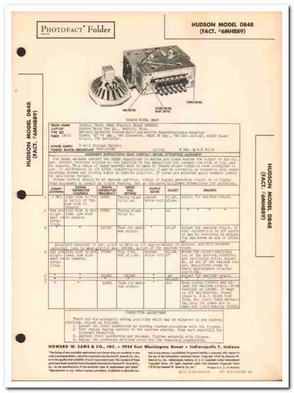 Vintage Radio Service Manual - HUDSON model DB48 (Factory No. 6MH889) 6-tube automotive car Superheterodyne AM radio receiver. Manufactured by Hudson Motor Car Company, of Detroit, MI. Dated 1948. 4 pages. Original old Sams Photofact manual includes schematic, layout, alignment instructions, dial cord drive, voltage & resistance test chart, repair parts list and description. This manual would make a sensational accompaniment to your retro audio equipment.