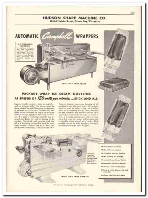 Manufacturers of Automatic Wrappers. Products include Campbell Automatic Wrappers package-wraps ice cream novelties at speeds of 150 units per minute, stick and all! Has numerous product images with detailed descriptions, uses, applications and dimensions provided. Unbound from a large 1956 dairy industry catalog, this unique old one page technical brochure would display beautifully matted and framed. Awesome cover graphics. A fantastic addition to your vintage dairy equipment library.
