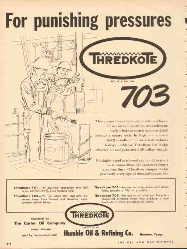Original oil and gas trade magazine vintage ad for HUMBLE OIL AND REFINING COMPANY of Houston, TX. For Punishing Pressures, ThredkoTe 703. Thread compound was developed for use on tubing strings in condensate wells where pressures are over 2,000 pounds a square inch. Marketed by The Carter Oil Company of Denver, CO. Unique 1953 old oilfield petroleum well industry magazine advertisement. Nice graphics.