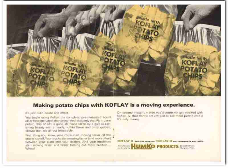 Original 1968 potato chip trade magazine vintage ad for HUMKO PRODUCTS, INC. Main office and factory was located in Memphis, TN. Making potato chips with Koflay is a moving experience. Begin with Koflay. the complete, pre-measured liquid oil or hydrogenated shortening. Suddenly that Plain Jane potato chip of old is gone, its place taken by a golden ravishing beauty with a heady. nutlike flavor and crisp, golden texture that are all but irresistible. This old two page snack food manufacturing advertisement would display beautifully matted and framed.
