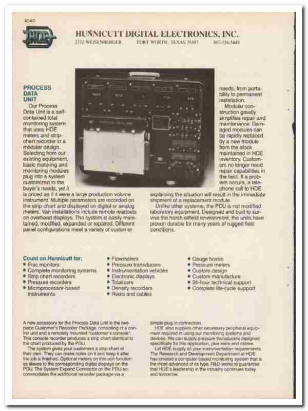 Original 1984 Oil and Gas trade vintage catalog for HUNNICUTT DIGITAL ELECTRONICS, INC. Main office and plant was located at 2732 Weisenberger Street, Fort Worth, TX.