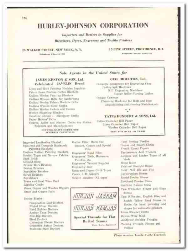 Original 1938 textile trade vintage ad for HURLEY-JOHNSON CORPORATION. Main office was located at 25 Walker Street, New York City, NY and also at 15 Pine Street, Providence, RI.