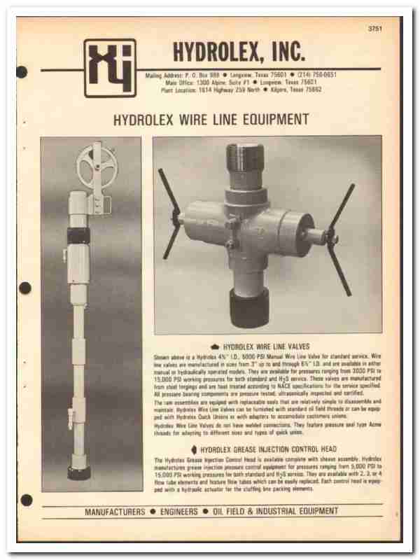 Products include Hydrolex Wire Line Valves, Hydrolex Grease Injection Control Head, Hydrolex Quick Unions, Grease Injection Power Unit, Hydrolex Wire Line Stuffing Box with Sheave Bracket Assembly, Wire Line Valve Stack, High Pressure Grease Supply Manifold and Well Head Adaptors, all are featured.