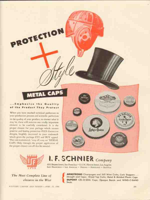 Original vintage food packaging trade magazine ad for I. F. SCHNIER COMPANY of San Francisco and Los Angeles, CA. Protection and Style Metal Caps Emphasize the Quality of the Product They Protect. Old Village, Three Star, Lady's Choice, Penguin Shrimp Cocktail, Nyman's Soil-Off, Santa Fe Wines. Armstrong Champagne and Still Wine Corks, Cork Stoppers, Dupont Del-O--Seal Caps, Qpaque Bands, Wind-O-Band Seals. This old 1946 food service industry canning and packing advertisement would display beautifully matted and framed.