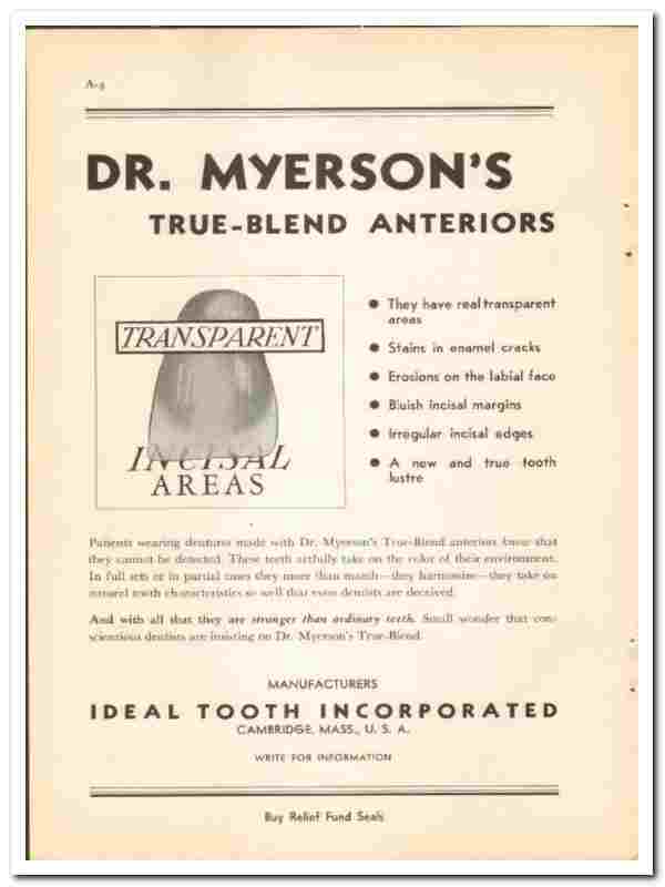 Ideal Tooth Inc 1938 vintage dental ad Dr Myerson True-Blend Anterior