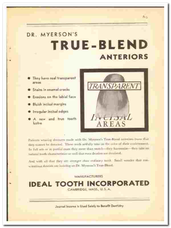 Ideal Tooth Inc 1938 vintage dental ad Dr Myerson True-Blend Anterior