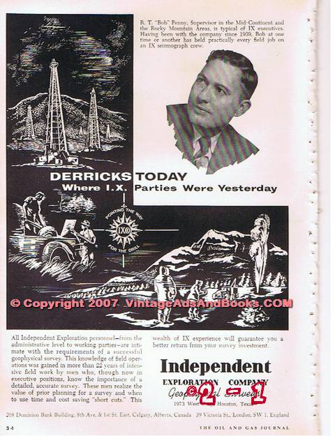 Original oil and gas trade magazine vintage ad for INDEPENDENT EXPLORATION COMPANY. Main office was located at 1973 West Gray Street, Houston, TX Pictured is Mr R. T. Bob Penny, supervisor in the Mid-Continent and Rocky Mountain areas, has held practically every field job on an IX seimograph crew. Geophysical Surveys of Houston, TX. Derricks Today Where I.X. Parties Were Yesterday. Unique 1955 old oilfield petroleum industry magazine advertisement would look sensational matted and framed. Great graphics. Approximate size 9 x 12 inches.