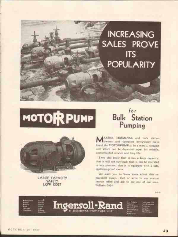 Original oil and gas trade magazine vintage ad for INGERSOLL-RAND COMPANY. Main office was located at 11 Broadway, New York City, NY. MotorPump Increasing Sales for Bulk Station Pumping and Marine Terminal. This unique 1937 old petroleum products industry magazine advertisement would display beautifully matted and framed. Nice graphics.