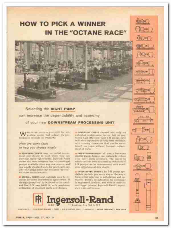 Original oil and gas trade magazine vintage ad for INGERSOLL-RAND COMPANY. was located at 11 Broadway, New York City, NY. Octane Race winner right pump for new downstream processing unit. Whatever process you pick for upgrading motor fuel octane, its performance depends on pumps. This unique 1959 old petroleum products refining industry magazine advertisement would display beautifully matted and framed.