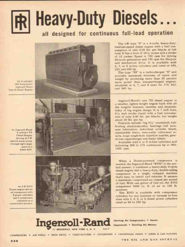 Original vintage oil and gas trade magazine ad for INGERSOLL RAND COMPANY. Main office and factory was located in New York City, NY. Heavy Duty Diesels, All Designed for Continuous Full Load Operation. Type S, TS, XVO engines. Old 1954 petroleum industry oilfield and refinery advertisement.