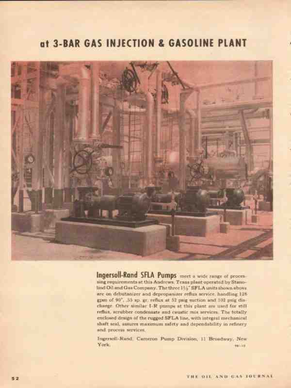 Original oil and gas trade magazine vintage ad for INGERSOLL RAND COMPANY. Main office was located at 11 Broadway, New York City, NY. 3 Bar Gas Injection and Gasoline Plant in Andrews, Texas with Ingersoll-Rand SFLA Pumps Operated by Standlind Oil and Gas Company. Cameron Pump Division. Unique 1954 old petroleum products refining industry equipment magazine advertisement. Great graphics.