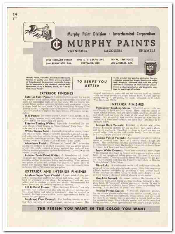 Murphy Paints, Varnishes, Enamels and Lacquers, famous for quality since 1866, are new products of Interchemical Corp, nationally known for its leadership in the chemical coatings field.