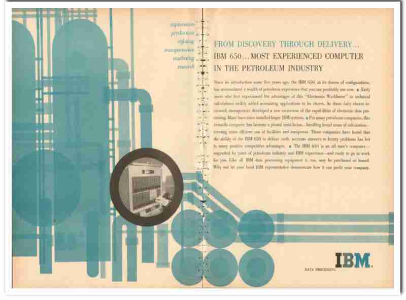 Original vintage magazine ad INTERNATIONAL BUSINESS MACHINES. IBM 650 computer for oil industry. Handles broad areas of calculation, creating more efficient use of facilities and manpower. Data processing, ready to go to work for you. Exploration, production, refining, transportation, marketing, research.