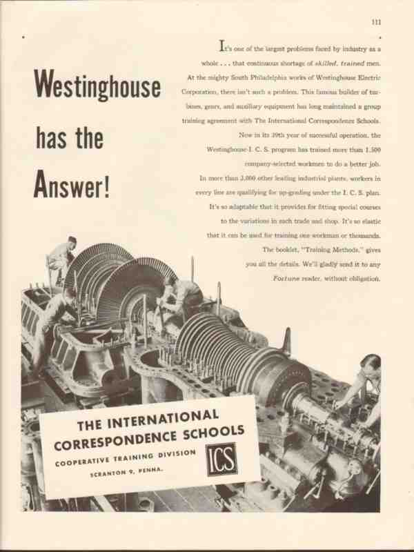 Original old business trade magazine ad for THE INTERNATIONAL CORRESPONDENCE SCHOOLS. Main office was located in Scranton, PA. Cooperative Training Division. Westinghouse Has The Answer! ICS program has trained more than 1500 company selected workmen to do a better job. This 1947 magazine advertisement would display beautifully matted and framed.