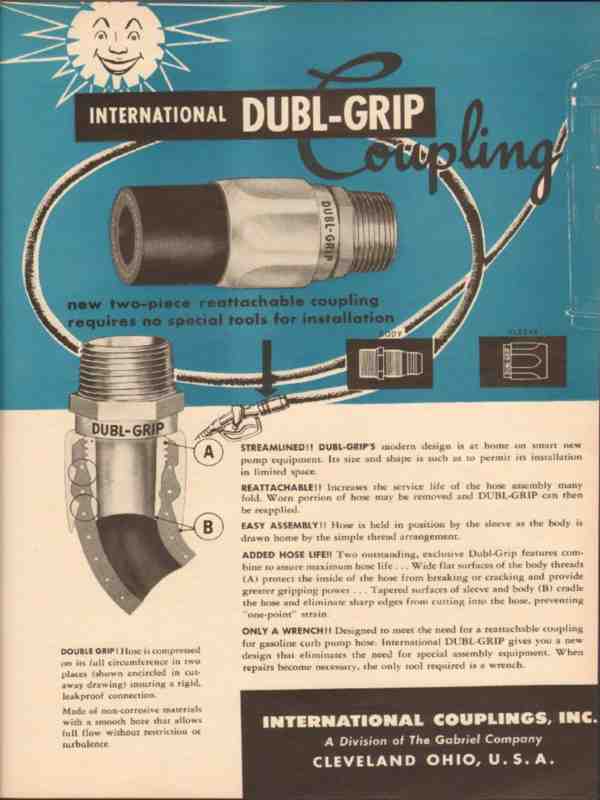 Original oil and gas trade magazine vintage ad for INTERNATIONAL COUPLINGS, INC. of Cleveland, OH. Division of The Gabriel Company. International Dubl-Grip Coupling for gasoline pump hose. Unique 1955 old gasoline service station equipment magazine advertisement.