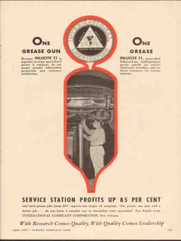 Original oil and gas trade magazine vintage ad for INTERNATIONAL LUBRICANT CORPORATION of New Orleans, LA. Inlucite 21. One Grease Gun, One Grease. Profits up 85 per cent reports one major oil company. Unique 1955 old gasoline service station grease industry equipment magazine advertisement. Nice graphics.