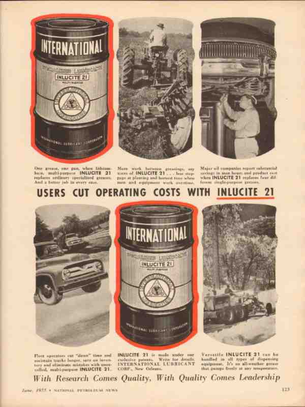 Original oil and gas trade magazine vintage ad for INTERNATIONAL LUBRICANT CORPORATION of New Orleans, LA. Inlucite 21 Users Cut Operating Costs. One grease, one gun. Unique 1955 old gasoline service station lubrication industry magazine advertisement.