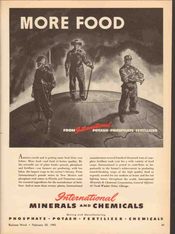 Original World War 2 business industry trade magazine vintage ad for INTERNATIONAL MINERALS AND CHEMICAL CORPORATION of Chicago, IL. More Food From International Potash, Phosphate, Fertilizer. America needs and is getting more food than ever before by use of plant foods. Old 1943 WW2 era propaganda magazine advertisement.