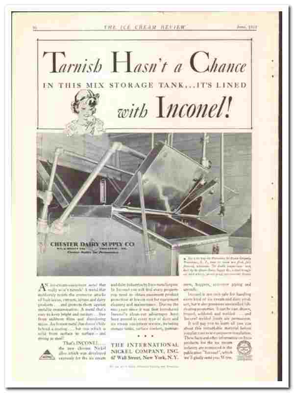 Manufacturers of INCONEL Metal for the Dairy and Ice Cream Equipment. 'Tarnish Hasn't a Chance in the Mix Storage Tank, it's Lined with Inconel'