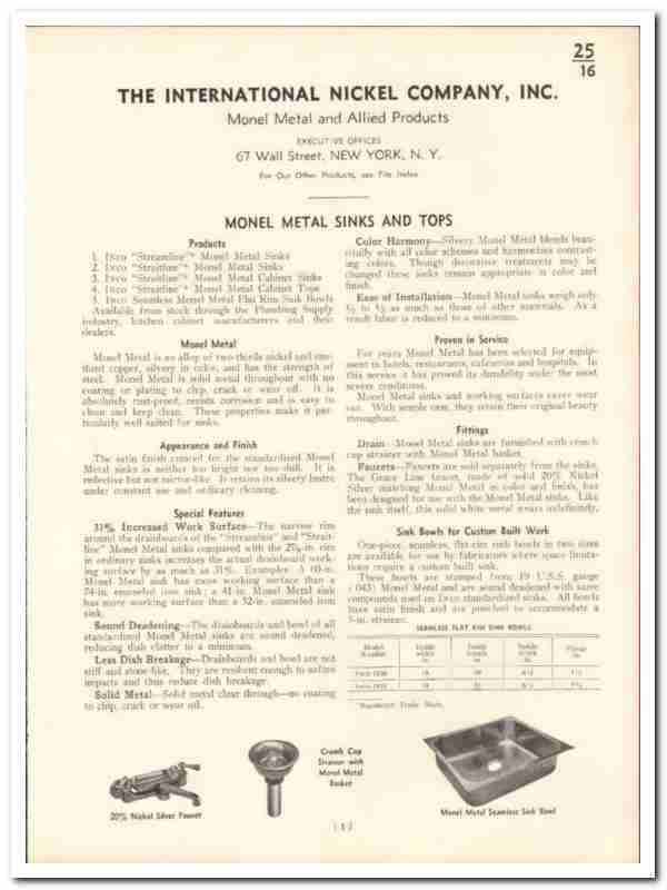 Manufacturers of Monel Metal Sinks and Tops. Products include INCO Streamline Monel Metal Kitchen Sink, INCO Straitine Monel Metal Kitchen Sink, 25-inch and 21-inch Straitine Monel Metal Kitchen Sinks are all featured. Has numerous product images with detailed descriptions, illustrations, applications, specifications and dimensions provided. Unbound from a large 1935 architectural product catalog, this unique old five-page brochure would display beautifully matted and framed. Nice graphics. A fantastic addition to your vintage construction materials library.