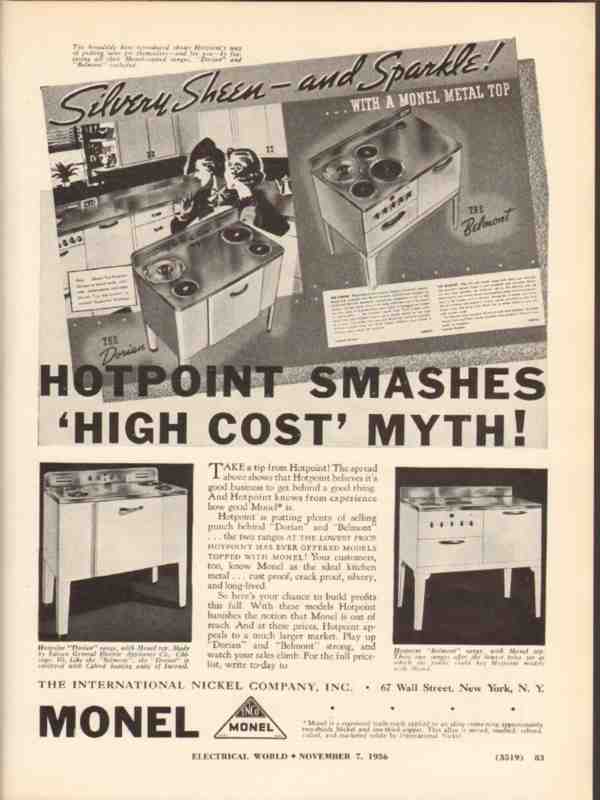 Original old industry trade magazine ad for THE INTERNATIONAL NICKEL COMPANY, INC. of New York City, NY.  Silvery Sheen and Sparkle with a Monel Metal Top Hotpoint Range.  The Dorian and The Belmont. This 1936 kitchen appliance industry magazine advertisement would display beautifully matted and framed.