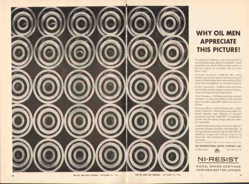 Original oil and gas trade magazine vintage ad for THE INTERNATIONAL NICKEL COMPANY, INC. was located at 67 Wall Street, New York City, NY. Why Oil Men Appreciate this Picture. It's a picture of diffusers, soon to be installed in a bottom-hole pump. Made of Ni-Resist nickel austenitic iron. Nickel makes castings perform better longer. This unique 1962 old oilfield petroleum industry equipment magazine advertisement would display beautifully matted and framed. Nice graphics. Two page gatefold advertisement.