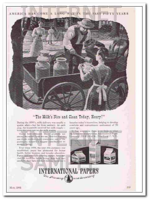 Original vintage industrial magazine ad, for INTERNATIONAL PAPER COMPANY of New York, NY. The Milk's Nice and Clean Today, Henry! We can thank modern paper containers, one of the packaging industry's biggest contributions to modern living. Old dated 1948 industry advertisement. (The scan shows a slight pink tint that is not on the actual ad.)
