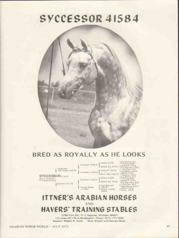 Original old equestrian trade magazine vintage ad for ITTNER'S ARABIAN HORSES in Saginaw, MI. Syccessor 41584 bred as royally as he looks. Sire Cedarel Heritage, dam Synob. Lineage includes Synbad, Lallegra, Hajah Baba, Julep, Sahra, Imaraff, Bint Abu, Sahra Su, Handeyraff, Shara Sabba, Gulastra, Aziza, Indraff, Fa-Rahna, Raffles, Imagida, Abou, Yatana, Gulstra, Aziza, Indraff, Abou, Safar. Owners Robert H. Ittner, Clyde and George Haver. Photo by Polly Knoll. This unique 1972 Arabian horse breeding advertisement would display beautifully matted and framed.