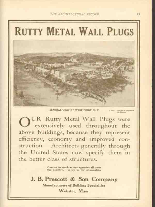 Original vintage architectural trade magazine ad for J. B. PRESCOTT AND SON COMPANY. Main office and factory was located in Webster, MA. Birds Eye View of West Point, NY. Rutty Metal Wall Plugs were extensively used throughout the above buildings, because they represent efficiency, economy and improved construction. Old 1911 building construction industry advertisement.
