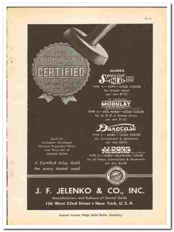 J F Jelenko Company 1938 vintage dental ad inlay golds certified