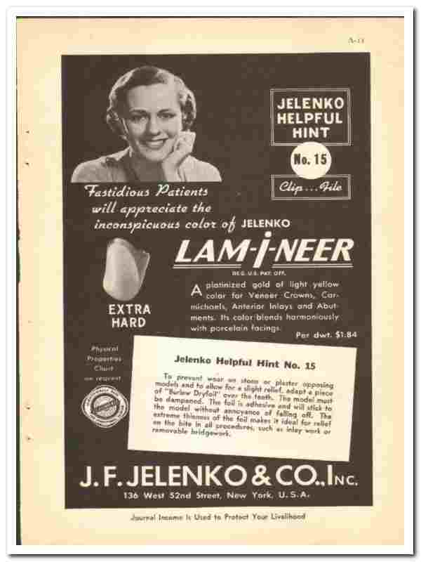 J F Jelenko Company 1938 vintage dental ad Lam-i-Neer crowns inlays