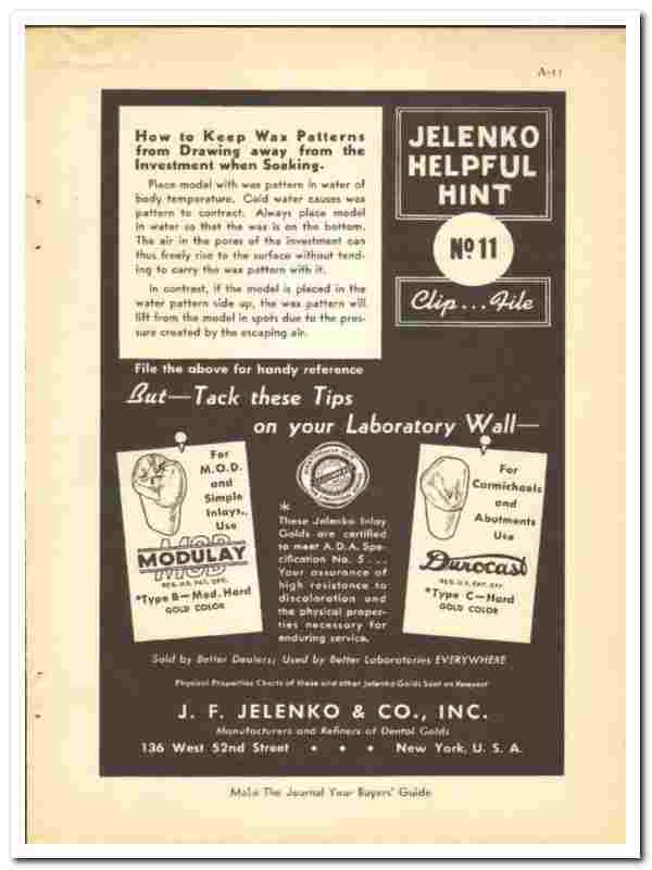 J F Jelenko Company 1938 vintage dental ad wax patterns investment