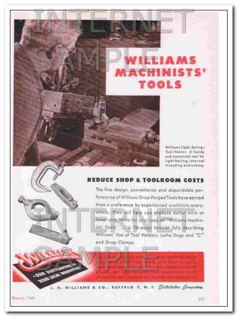 Original vintage industrial magazine ad, for J. H. WILLIAMS COMPANY. Main office and factory was located in Buffalo, NY. Williams Machinists Tools. Williams Light, Boring-Tool Holder, Drop-Forged Tools. Old 1948 industry advertisement. (The scan shows a slight pink tint that is not on the actual ad.)